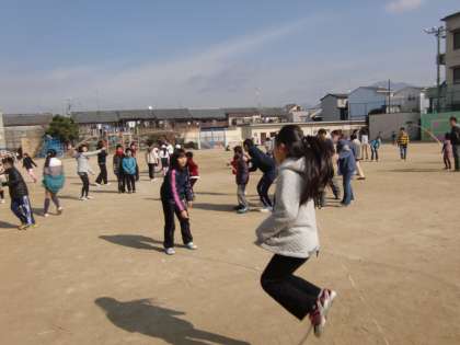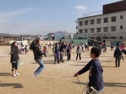 今日の中間休みはライオングループの『にこにこタイム』です。運動場で大なわとびをしています。1年生にはまだちょっと難しいかなとは思いますが,高学年の子がうまくリードして,みんなで楽しんでいます。