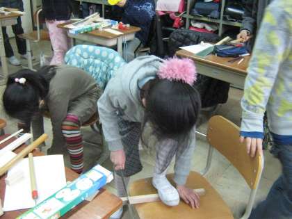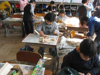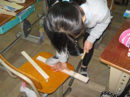 木を使って,木を切ったり付けたり,釘を打ったりして色々な物を作っています。のこぎりをひいて木を切っている姿は真剣そのものです。