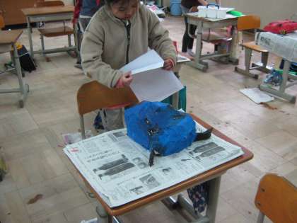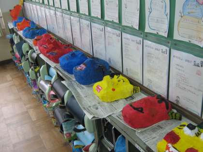2年生の図工で,「おにのおめんをつくろう」という学習に取り組んでいます。だいぶ出来上がってきています。たくさん並んだ姿は勇壮です。図工展では保護者の皆様にも見ていただけると思います。