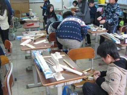 「トントンサクサク木の名人」の学習で,何時間かのこぎりで木を切ることに挑戦して,だいぶ上手になってきました。金づちで釘を打つことも慣れてきました。今回,初めてのこぎりで木を切ったという児童もいますが,なかなか上手です。