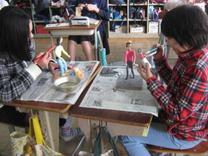 ニスを塗って仕上げます。中には紙や布を使って装飾している子もいるので,どこまでニスを塗ろうか悩みながら仕上げていました。