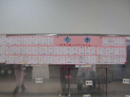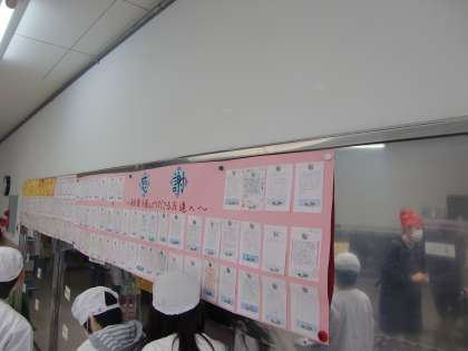 給食室サービスホールの掲示物が増えています。給食感謝週間に4年生が取り組んだ「給食を運んでくださる方達へ」の感謝の気持ちを伝える掲示物です。