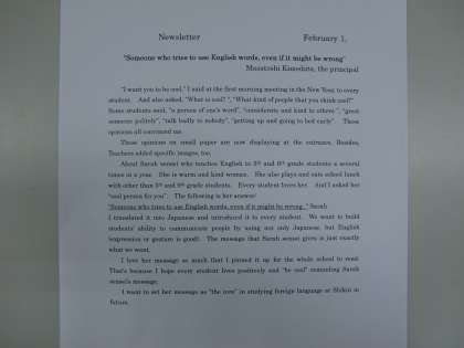 おかげで,今日,『しきん』と英訳の文章をサラ先生にプレゼントすることができました。サラ先生に手渡すと,食い入るような眼で英訳を読んでいました。そして,読み終えた時の彼女の笑顔が印象的でした。