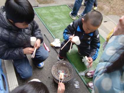 3年2組の七輪体験です。前回,なかなかうまく火がおこせなかったものですから,今日はそのリベンジです。どのグループも無事に炭火を作ることができました。