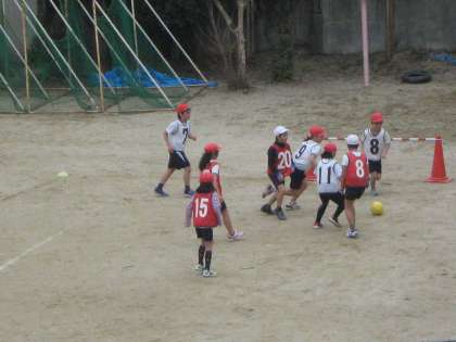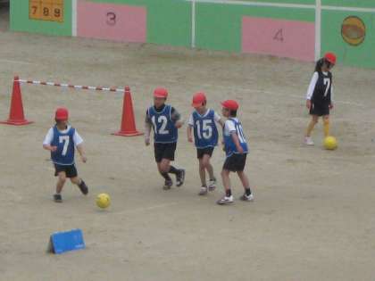 コートを2つ使ってサッカーをしました。4年生はボールを蹴る技術も上手で,動きも機敏です。交代しながらプレーをしますが,応援する側も頑張っていました。