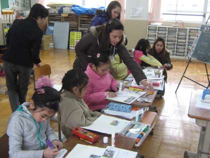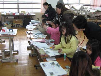 日本語教室の学習の様子を保護者の皆さんに見てもらいました。昨日のホームページでも紹介しましたが,子どもたちは手作りの「アルバム」を製作中で,その学習の様子を見てもらいました。また,後半は保護者の方にも参加してもらって,カルタをしました。「子どもチーム」対「保護者チーム」で合計枚数を競いました。