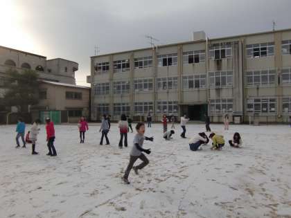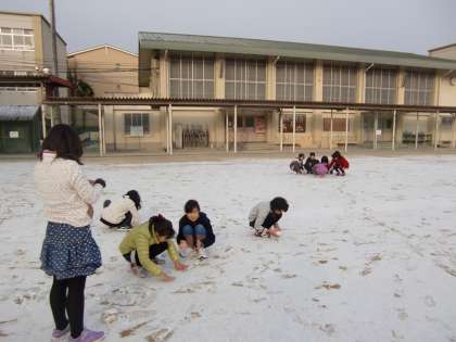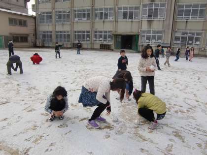 ホントにわずかに積もった雪なのに,子どもたちは早速雪遊びです。雪玉が作れるほどの積もり方ではなく…, それでも子どもは雪が好きです。