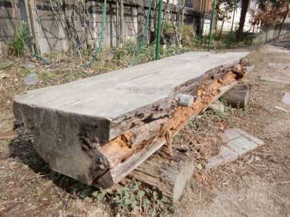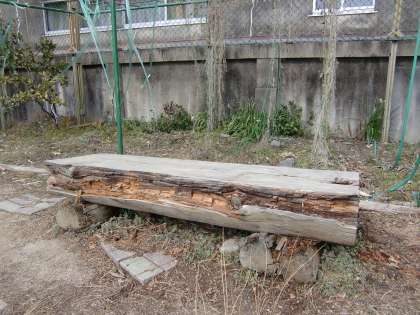ビオトープの池の橋のことを書きましたが,この写真もちょっと大変なことでしょ。池の北側にある丸太のベンチです。朽ちてフニュフニュです。これも作りかえる必要がありますね。