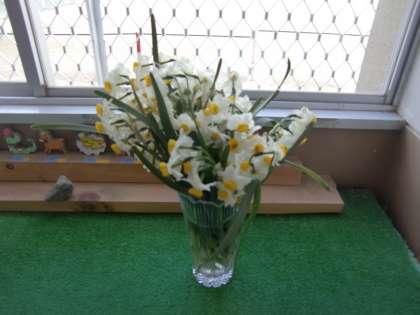 そのスイセンを花瓶にガサッと挿したものが職員室前の廊下に飾ってあります。「ワイルド!」以外の表現が見つかりません。