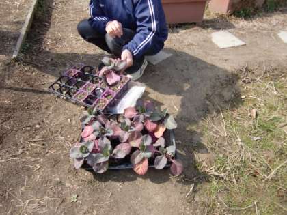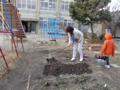 畑にクワを持つ人影。土を掘り起こしてウネを作っています。キャベツの苗植えの準備です。
