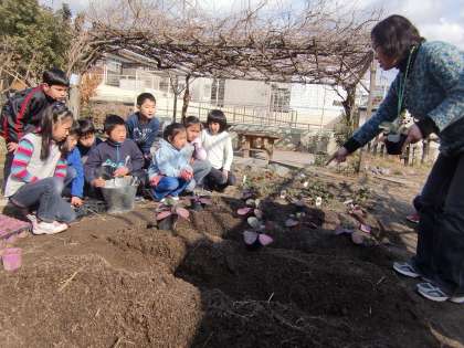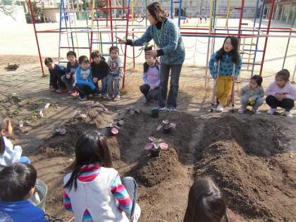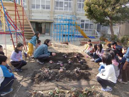 5時間目,ウネがしっかりでき上がった畑に2年生がキャベツの苗を植え付けていました。チョウの幼虫(アオムシ)がおいしそうに食べてくれそうなキャベツに育ってくれるでしょうか。