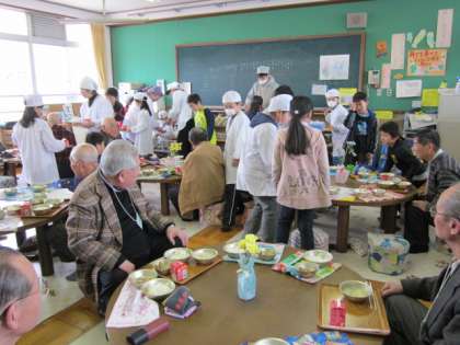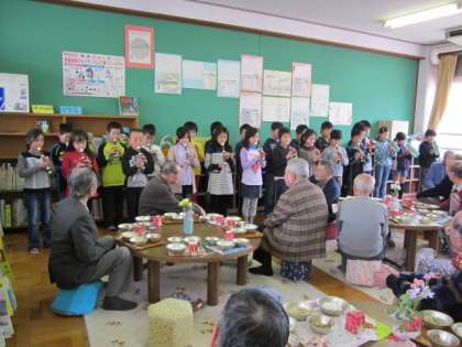 22日にすこやか給食がありました。地域の方と一緒に給食を食べるのは3年2組の子どもたちでした。地域の方に手伝ってもらいながら準備をして、練習をしてきたリコーダーの演奏をしました。待っている間も、話がはずんだようです。