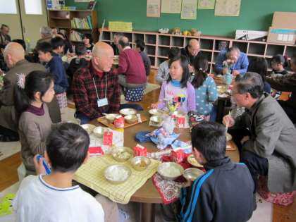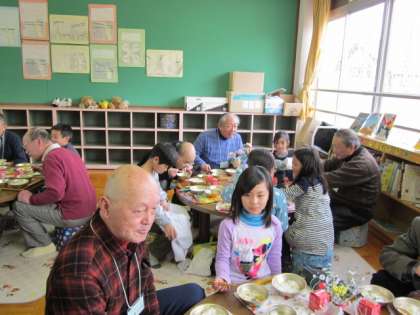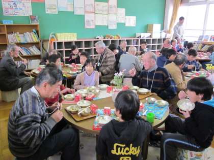 給食を一緒に食べている様子です。テーブルごとに一人ずつ自己紹介をして,昔の道具についてお話を聞きました。