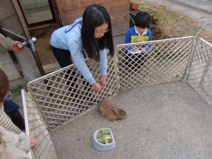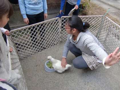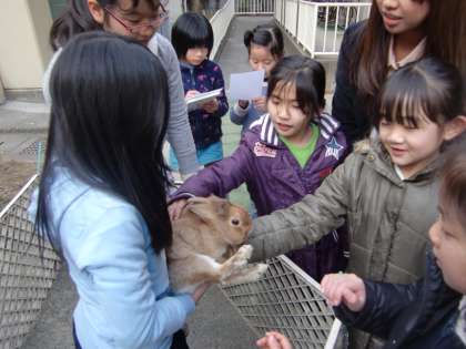 中間休みに,飼育委員の子がウコッケイとうさぎのショコラを小屋から出して低学年の子を中心に触らせてくれました。
