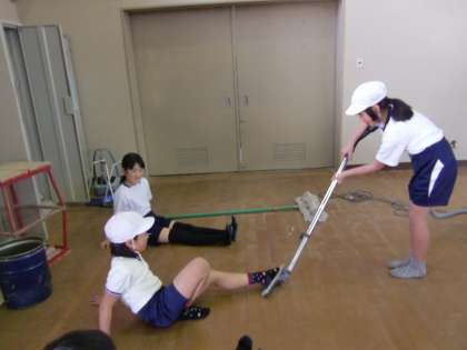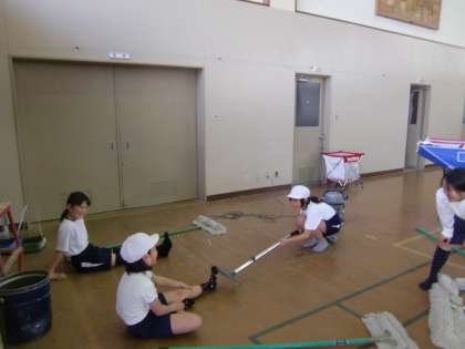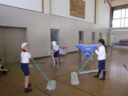 掃除時間に体育館の床にモップがけしながらゴミを集めてくれていたのは4年生でした。