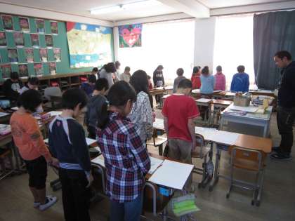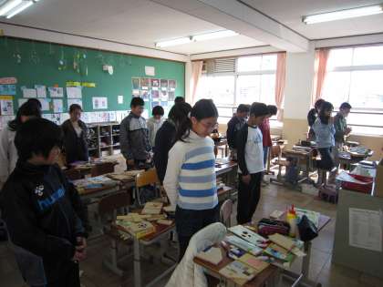 東日本大震災の犠牲者に向けて黙祷を捧げました。教室で今日の日のことを担任から話を聞き、黙祷することは初めての子どもたちもいましたが、子どもたちなりに思いを込めて祈っていました。