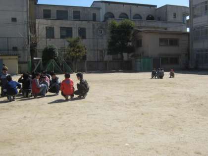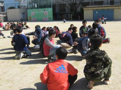 体育館で卒業式の練習をしていた後の時間ということもあり,たくさんの6年生が運動場で遊んでいました。