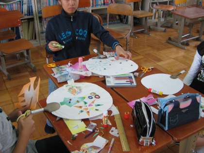 池田先生の指導のもと,うちわグループは,うちわにかざりをつけていきました。