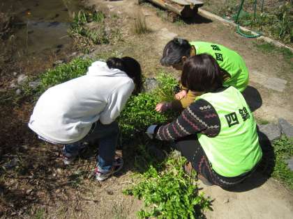 作業をしながらいろいろな発見もありました。セリの近くにおいしそうな名前の分からない草がたくさん生えていました。新しい花芽が丸く、少しモワモワした毛をつけていました。フジバカマの新しい芽が土から顔を出していました。ポカポカ陽気の中で、うれしい発見だらけでした。