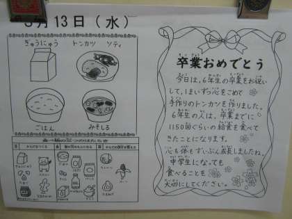 6年生が小学校での給食を食べるのもあとわずか。卒業をお祝いして「トンカツ」が出ました。一枚一枚揚げた手作りの「トンカツ」でした。6年生も今日の献立を楽しみに待っていました。