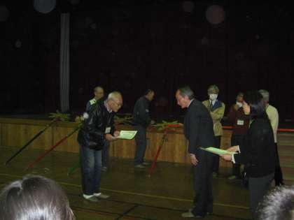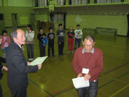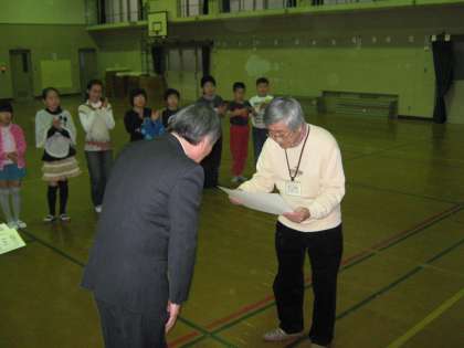 剣鉾保存会のボランティアの皆さんに校長先生から感謝状をお渡ししました。保存会の皆さんには,毎週の練習と大きな行事に際しては色々と準備をしていただき,子どもたちが持っている力を,十分に発揮できました。
