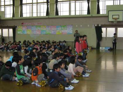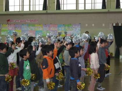 運動会で使ったキラキラを今回も活用しました。今日の曲は6年生に向けて、エールを送る曲です。本番は練習の時よりも声が出て、動きも良かったです。6年生もきっと喜んでくれたと思います。