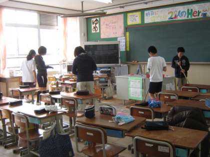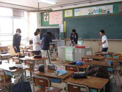 写真は,少ない人数で自分たちの教室掃除をがんばる様子です。