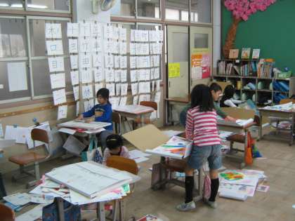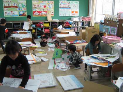 1年間に描いた絵や書き方の作品などを持って帰ります。特製の作品バッグに入れて大切に持って帰ります。お家でも見返してもらい,がんばりを認めていただけると子どもたちも来年度への意欲が増すと思います。