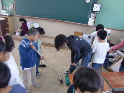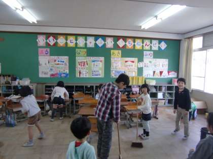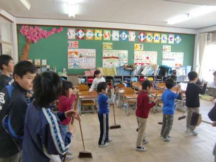 6年生が1年生と一緒に1年の教室を掃除しています。他の学年に回っている子もいるみたいです。この子たち,こうなんですよね。とっても親切で,小さい子にとってもやさしい6年生です。