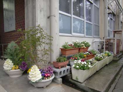 明日,6年生を送り出す玄関の花たちです。きれいなサクラソウは地域の方がくださいました。花瓶の花はいつものようにPTAからです。整いました。ありがとうございます。