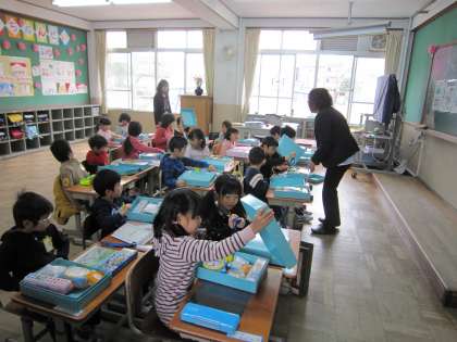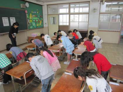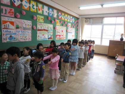 1年生がはじめに学ぶことはいっぱいあります。まずはあいさつです。声の出し方やおじぎの仕方。健康観察での答え方やプリントを配るときのお礼の言い方など…。それから、整列の仕方やろうかでの歩き方など、今日一日でいっぱい、いっぱい学びました。