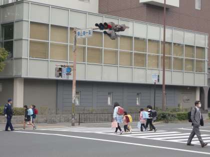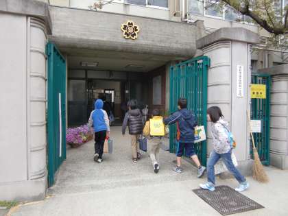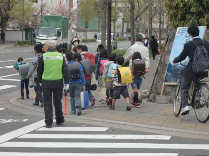 集団登校の子どもの中に黄色いランドセルカバーの1年生がちゃんといます。卒業までの6年間,長いようで短い,短いようで長い小学校生活の始まりです。