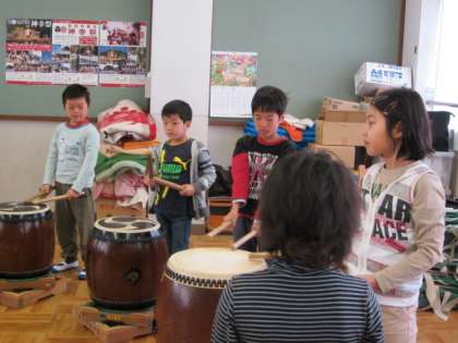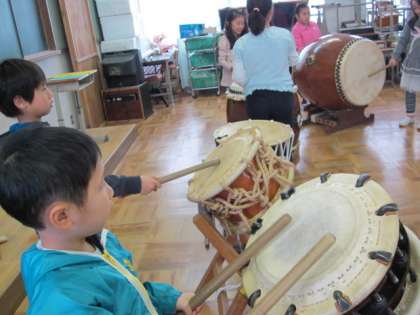 地域のボランティアの方にお世話になり、和太鼓を体験しました。子どもたちは、大きな音にびっくりしながらも、力強く太鼓を打って楽しみました。