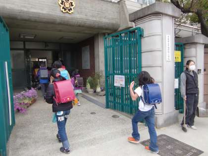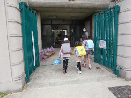 正門前で,「おはようございます。」と声をかけていますが,「…頑張って歩いたね,えらい,えらい。」という気持ちが自然に出てきます。