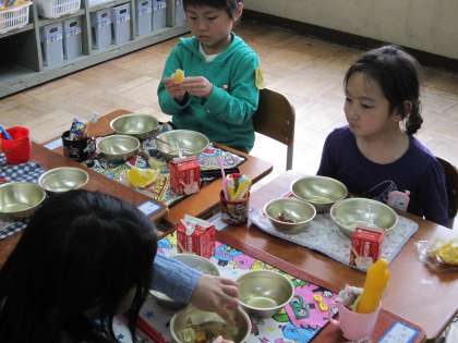 今日の給食には、「あまなつみかん」が登場しました。上の学年でも、なかなか上手に食べることができない子やすっぱさや苦みが苦手な子がいます。その「あまなつみかん」に1年生が挑戦しました。皮をむくだけでも一苦労。薄皮をひらくのも、なかなか難しいです。食べてみると顔がすっぱい顔に変身します。でも、ほとんどの子が、しっかり食べ切りました。
