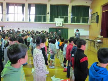 今日は、1年生から6年生までそろって初めての学校朝会でした。