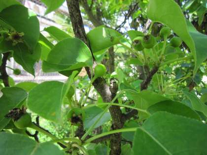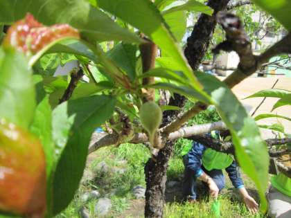 ビオトープには、みかんやりんご、ももやヤマモモ、ビワやキウイなど実のなる木がたくさんあります。今は花が終わり、花から実ができ始めています。赤ちゃんの実がたくさんありますが、大きな実にするには、剪定していかなければなりません。せっかくの花や実を落とすのは気がひけますが、立派な実にするには必要な作業です。収穫の時期に向けてトライしてみます。