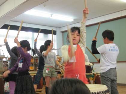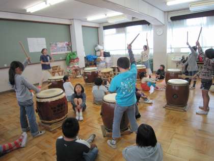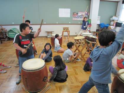 和太鼓の部活動もお祭りとケルン市との交流会へ参加します。経験者がお手本になり、しっかりリズムを刻んで太鼓をたたいています。初めて参加する子どもたちも、少ない回数で本番に向かいます。部屋の中は気合の入った音が鳴り響いています。引き締まった顔つきは、とてもかっこいいです。