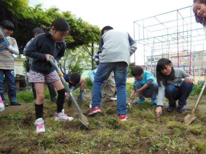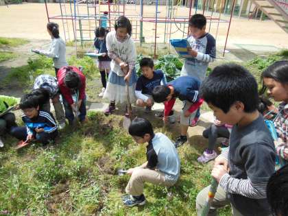 昨年の5年生が,今年のために植えてくれていたれんげ草ごと,田んぼを掘り起こしていきます。土は粘土質で少し固いことがわかりました。また,たくさんの虫やミミズが出てきました。
