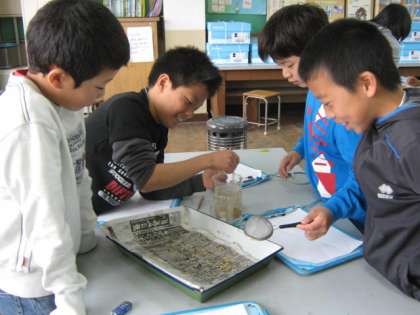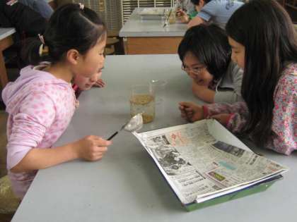 生卵が浮かぶくらいの濃度の塩水に種もみをいれると,軽い種もみが浮いてきます。それを網ですくいました。浮いた種もみも沈んだ種もみも,今は教室で乾かしています。