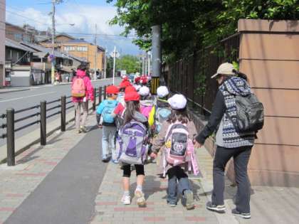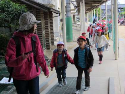 出発時から、1年生と2年生のなかよしグループで、手をつないでいます。