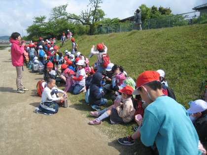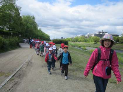 学校で,なかよしグループごとに並び,先生から安全等のお話を聞いた後にいよいよ出発です。鴨川沿いを二列で歩いて行きました。長い道のりなので,途中でお茶の休憩をして,また植物園へ向けて歩きました。