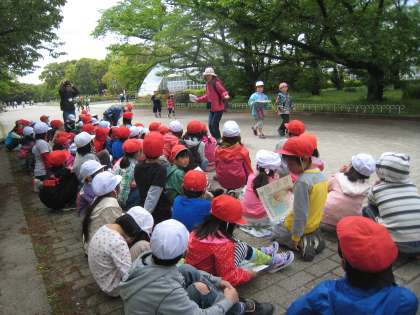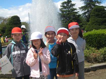 植物園に到着すると,芝生広場に荷物を置いてウォークラリーの始まりです。ウォークラリーには,ポイントが2つあって,ポイント2の噴水広場の前では,なかよしグループごとに記念撮影をしました。