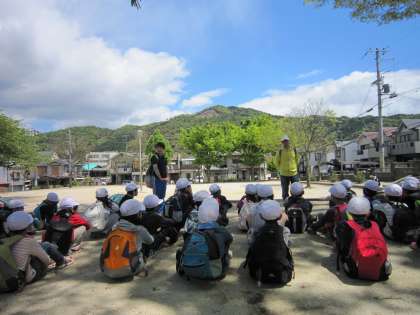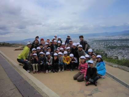 今日は少し不安定なお天気でしたが、山の上からの景色は最高でした。例年春の霞がかかっていることが多いのですが、今日はとてもくっきりとまちの様子が見えました。大文字の中心部(金尾)へ向けて学校から教頭先生に鏡で光を送っていただくと、ぴかっぴかっと子どもたちの目に光が飛び込んできました。子どもたちは、「見えた」「学校はあそこや」と目を輝かせていました。