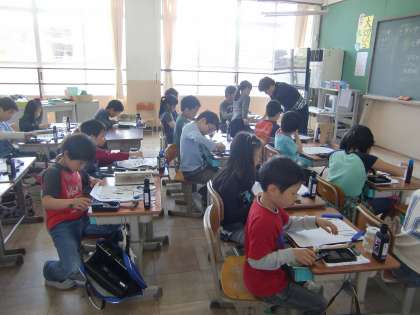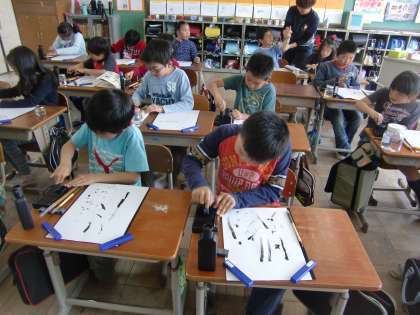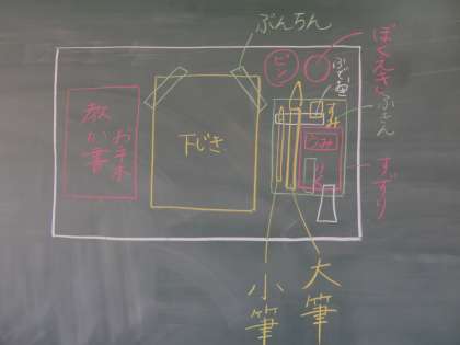 習字セットを机の上に出して,3年生が初めての習字の授業です。