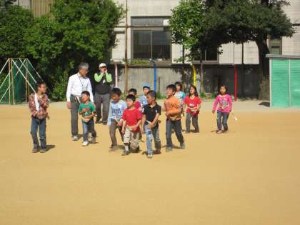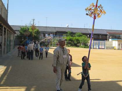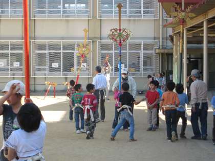 3年生はまず歩く練習から。独特の足の折り方、リズムで足を運びます。剣鉾をさすとバランスを気にしながら上を見てカネを鳴らしながら進みます。3年生も、上の学年の子どもたちも、晴れの舞台に向けて、どの子も一所懸命でした。