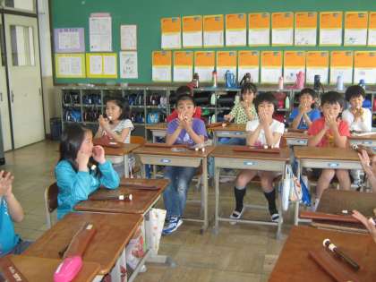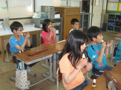 3年生になって,リコーダーを初めて学習します。今日がその初日!まず,リコーダーの頭部管だけを使って音を色々出してみました。そして,息の出し方やタンギングの仕方を練習しました。「シ」の音がきれいに出ました。
