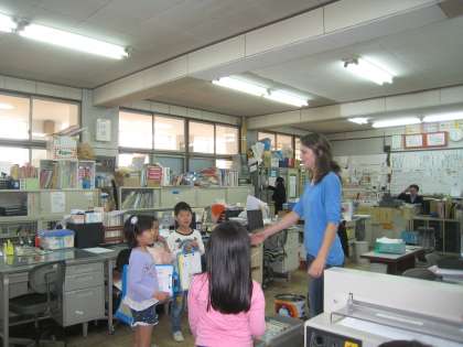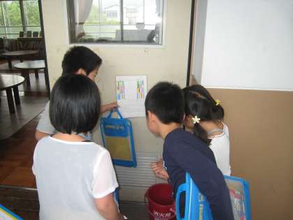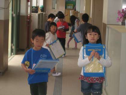 3,4時間目の生活科で,1年生と2年生が,学校探検を行いました。1年生は,2年生のお兄さんお姉さんに,学校の中のいろいろな場所に連れて行ってもらいました。そして,教室の名前や,どんなことをする場所なのかを,分かりやすく教えてもらいました。 職員室では,サラ先生と“What's your name?”“My name is〜.”と交流するグループもありました。