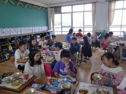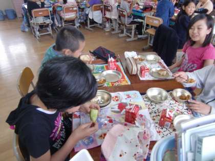 ALTのサラ先生が4年生の教室で給食を食べています。