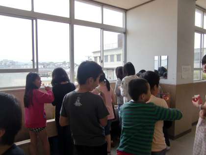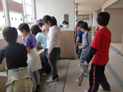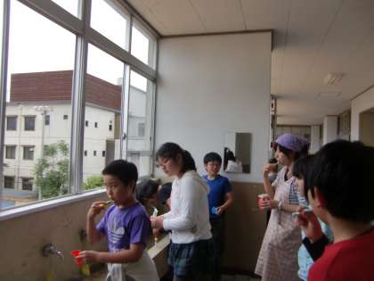 写真は給食後の歯磨きをしているところです。給食を食べ終わった子が水道の所まで来て歯磨きをします。ここは本館3階です。4・5・6年生が一緒に水道を使っています。